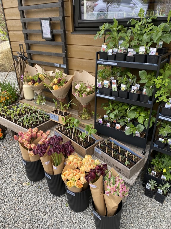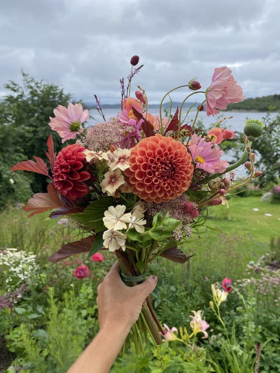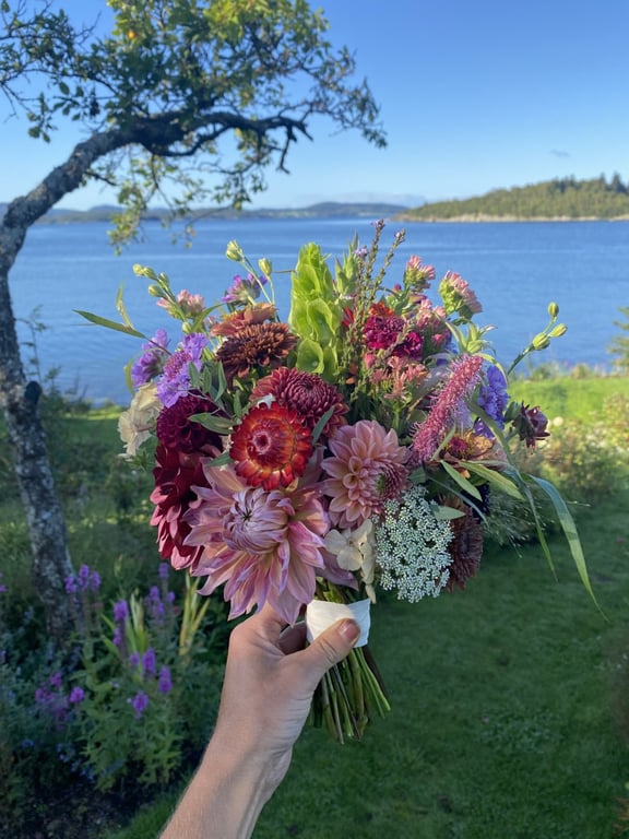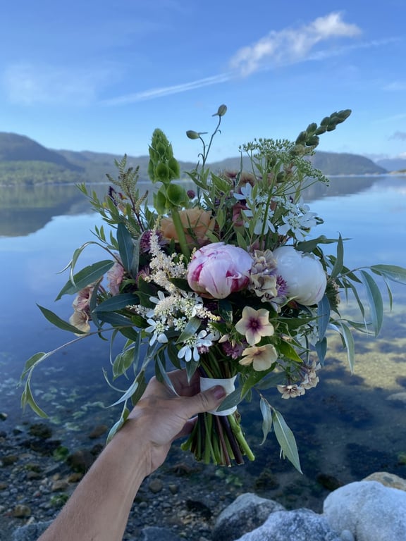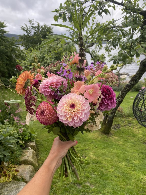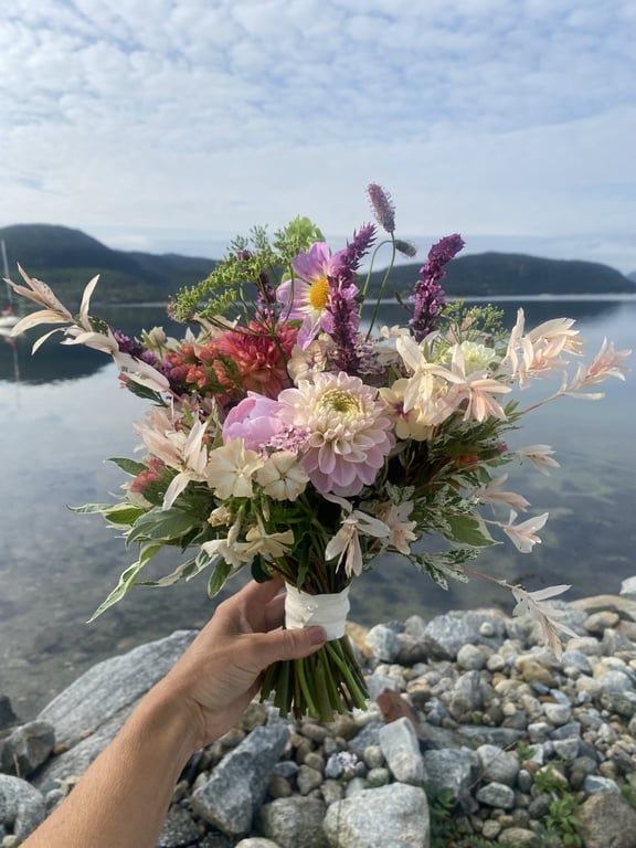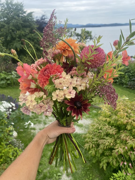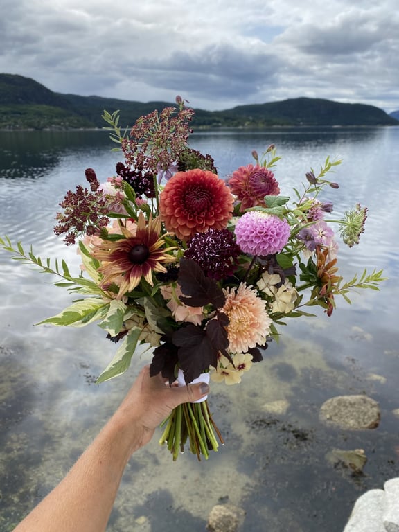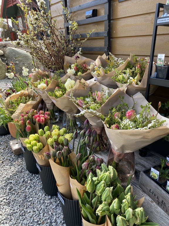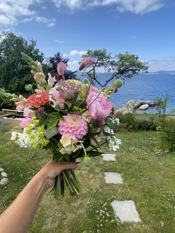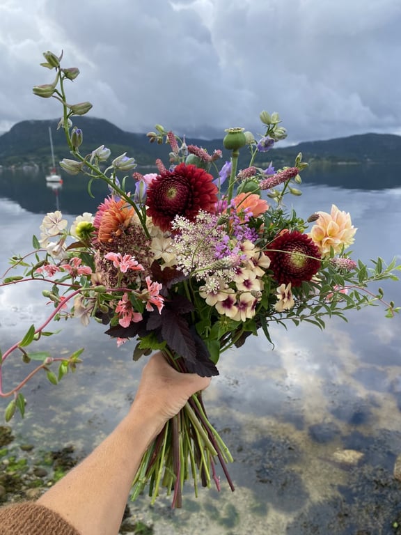 Hos oss kan du kjøpe egendyrka, sprøytefrie sesongblomster. Blomstene kommer fra hagen vår ved sjøen og de er dyrket frem med stor GLEDE. I april begynner tulipanene. Deretter overtar ranunkler, anemoner og peoner sammen med andre tidlige stauder. Til slutt kommer årets høydepunkt med dahliaene og et stort utvalg sommerblomster.