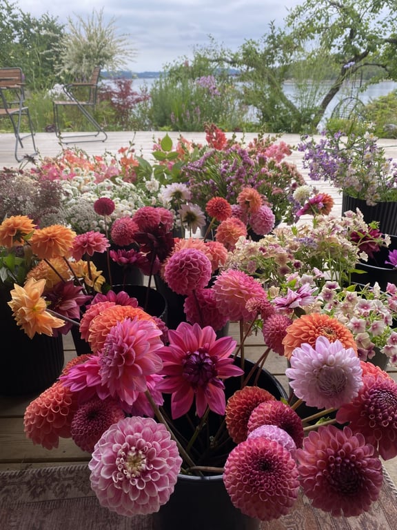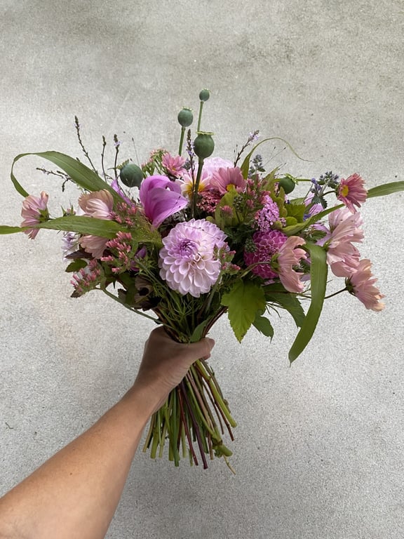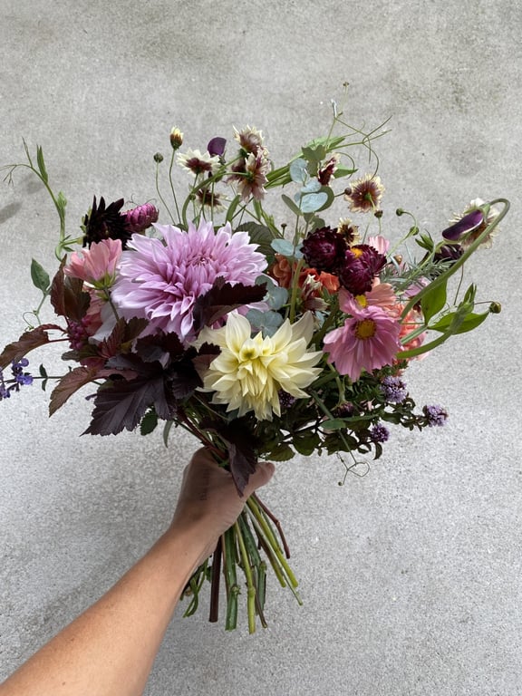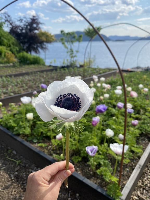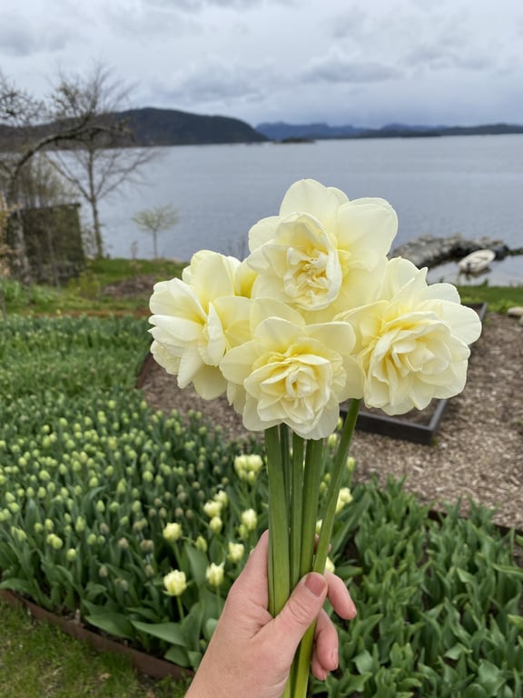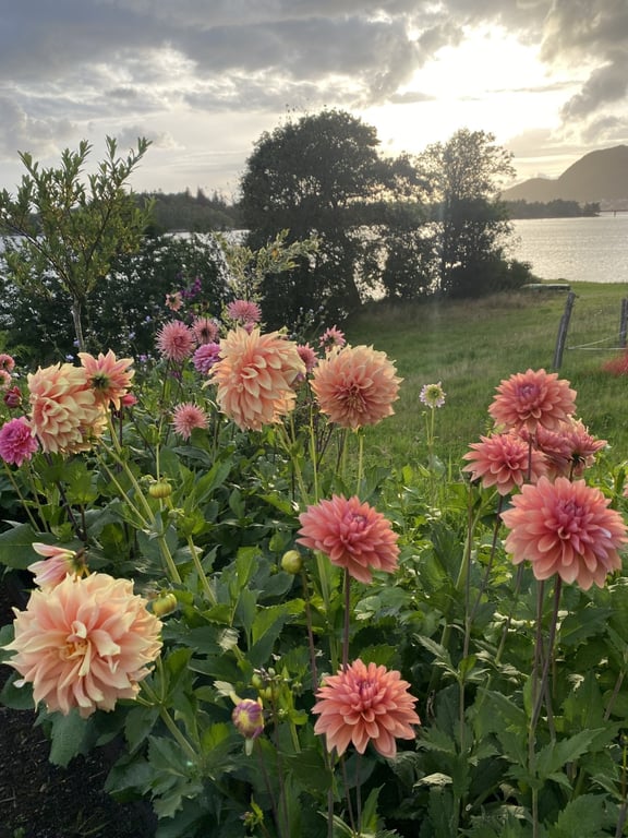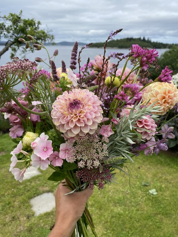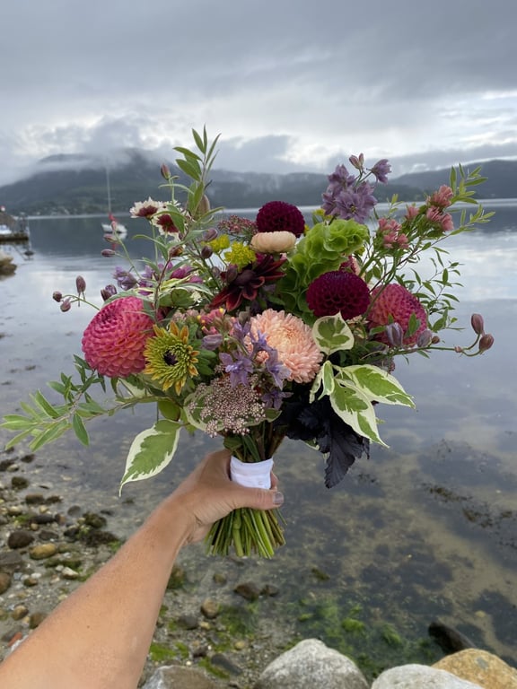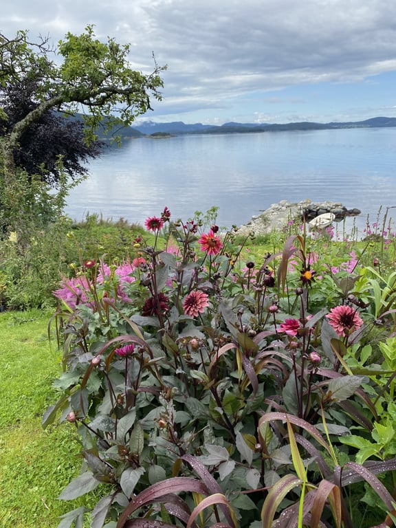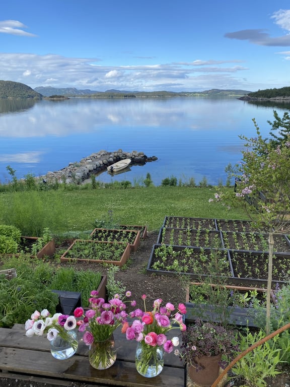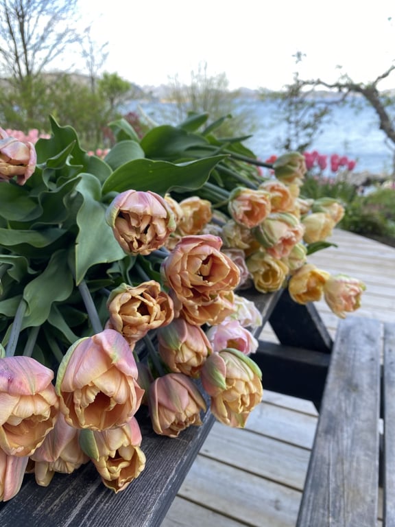 Hos oss kan du kjøpe egendyrka, sprøytefrie sesongblomster. Blomstene kommer fra hagen vår ved sjøen og de er dyrket frem med stor GLEDE. I april begynner tulipanene. Deretter overtar ranunkler, anemoner og peoner sammen med andre tidlige stauder. Til slutt kommer årets høydepunkt med dahliaene og et stort utvalg sommerblomster.
