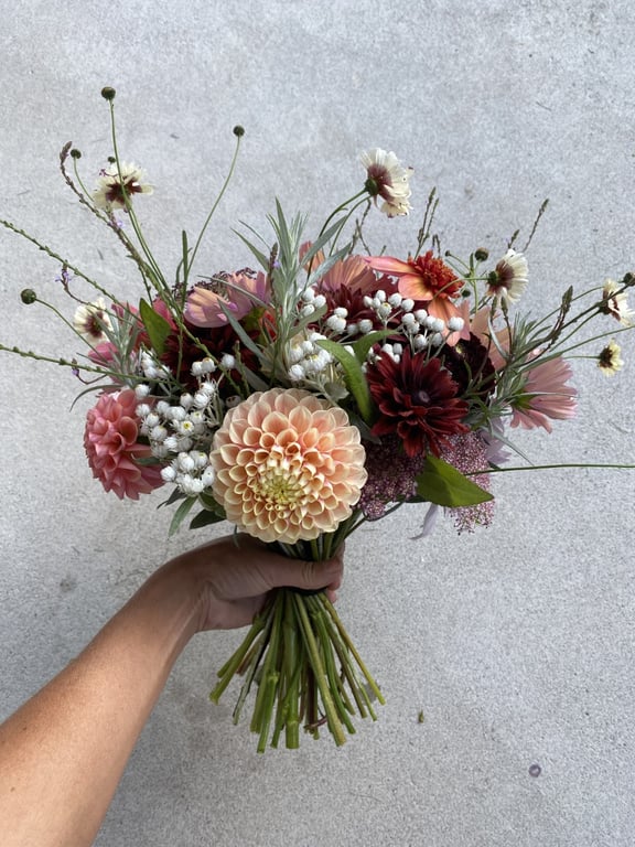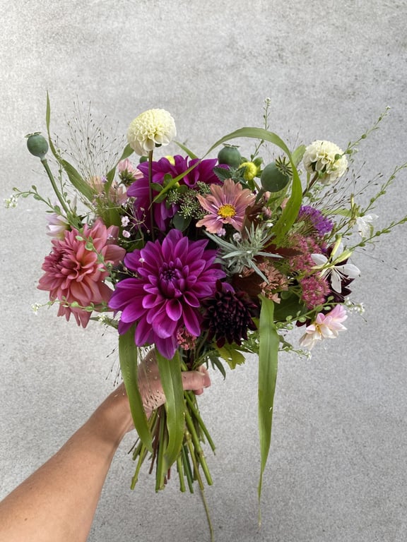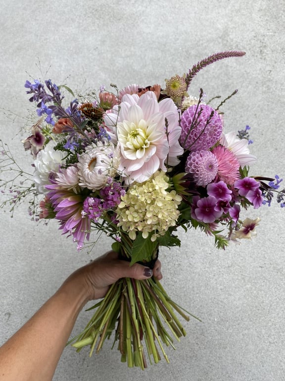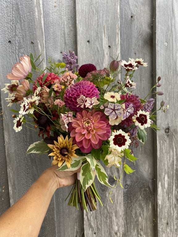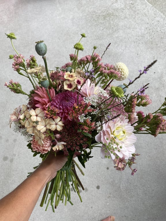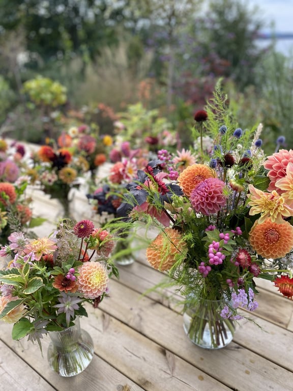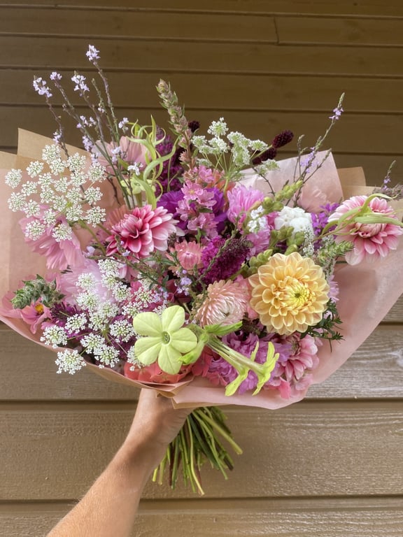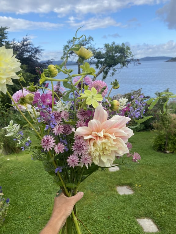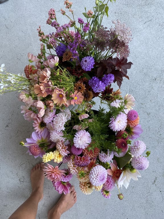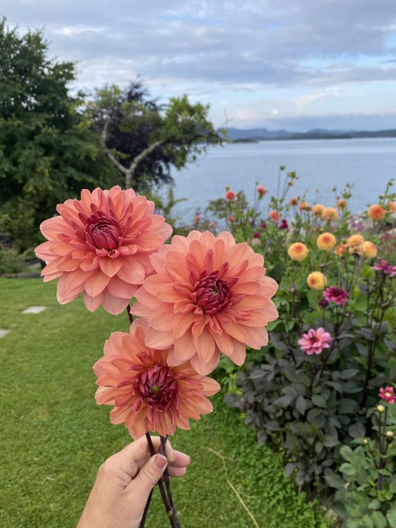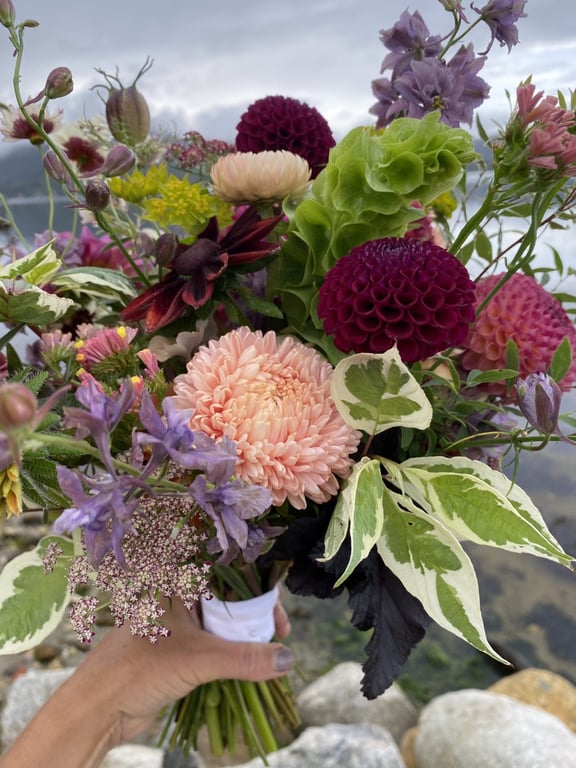 Hos oss kan du kjøpe egendyrka, sprøytefrie sesongblomster. Blomstene kommer fra hagen vår ved sjøen og de er dyrket frem med stor GLEDE. I april begynner tulipanene. Deretter overtar ranunkler, anemoner og peoner sammen med andre tidlige stauder. Til slutt kommer årets høydepunkt med dahliaene og et stort utvalg sommerblomster.