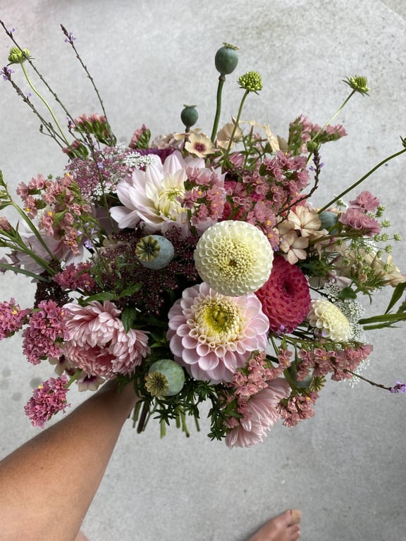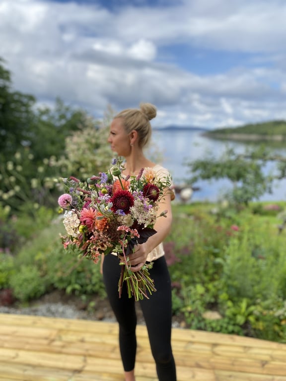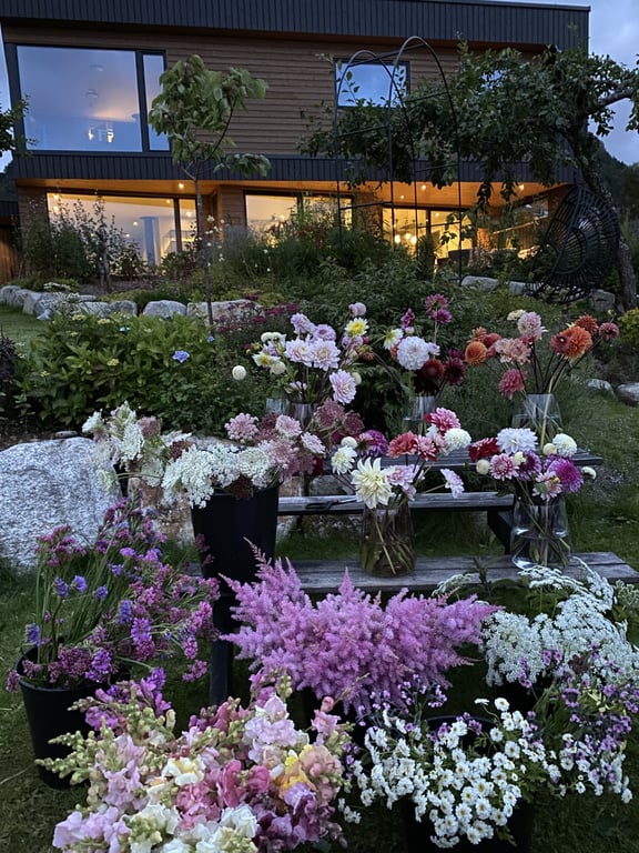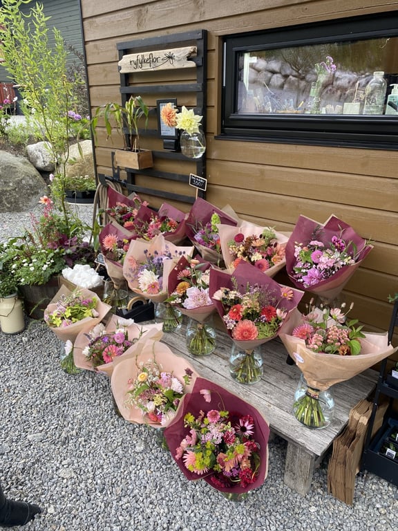 Jeg som driver Ryfylkeflor heter Malin og er utdannet lærer. Men en stor hageinteresse og blomsterglede utviklet seg til dette foretaket som ble startet høsten 2023. Jeg, min mann og tre barn overtok eiendommen ved sjøen etter min bestemor sommeren 2019. Vi bygde nytt hus i 2022 og samtidig opparbeida vi hagen og fikk laga mye plass til snittblomstdyrking. Jeg finner stor glede i å være i hagen og liker hele prosessen med blomsterdyrkinga. Helt fra frøene sås på starten av året og frem til blomstene høstes og skal brukes til å spre glede eller til å gi trøst.